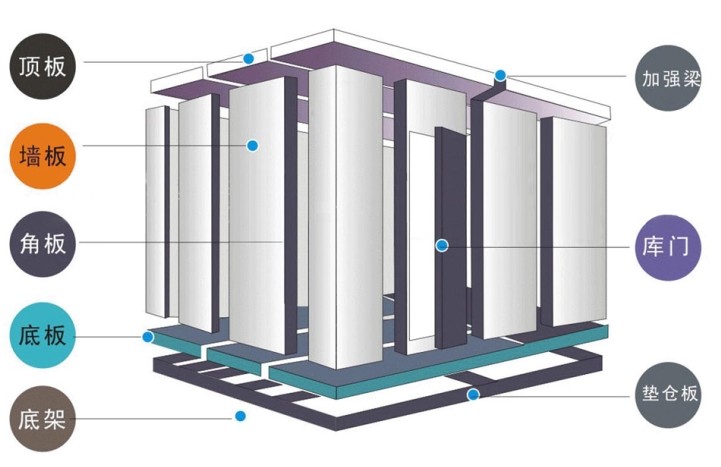組合式冷庫保溫一般主要由隔熱壁板(冷庫墻體)、頂板(冷庫天花天板)、支承板、冷庫底座、冷庫門組成。組合式冷庫多通過特殊結構的子母鉤拼裝、固定,以保證組合冷庫良好的隔熱性與氣密性。