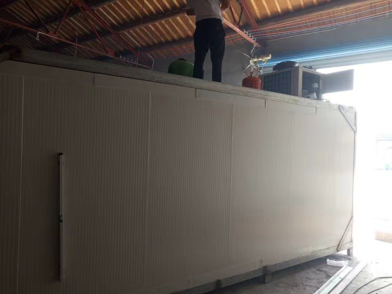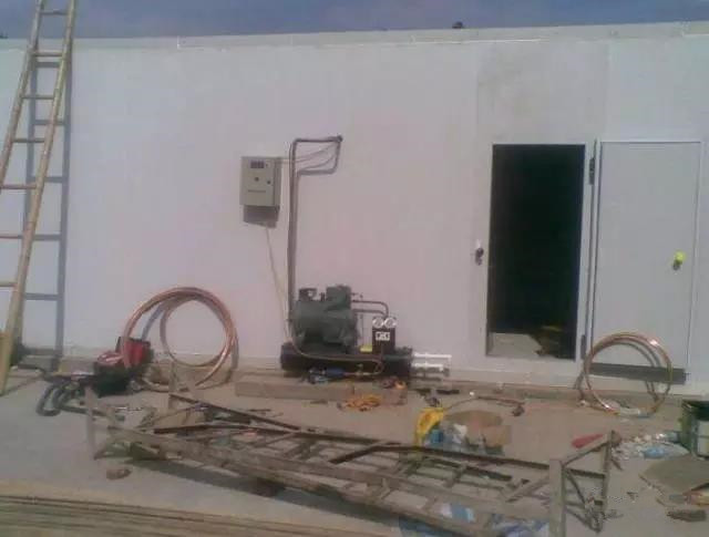 根據場地情況先選一角,并定位(即立板與地板鎖緊)以此角向兩邊延伸,只把立板與立板間鎖緊,遇到立角處就定位,美觀的板放于顯眼處,安裝到蒸發器那一面時,預先把排水管做好,庫外需做U型彎及打硅膠。